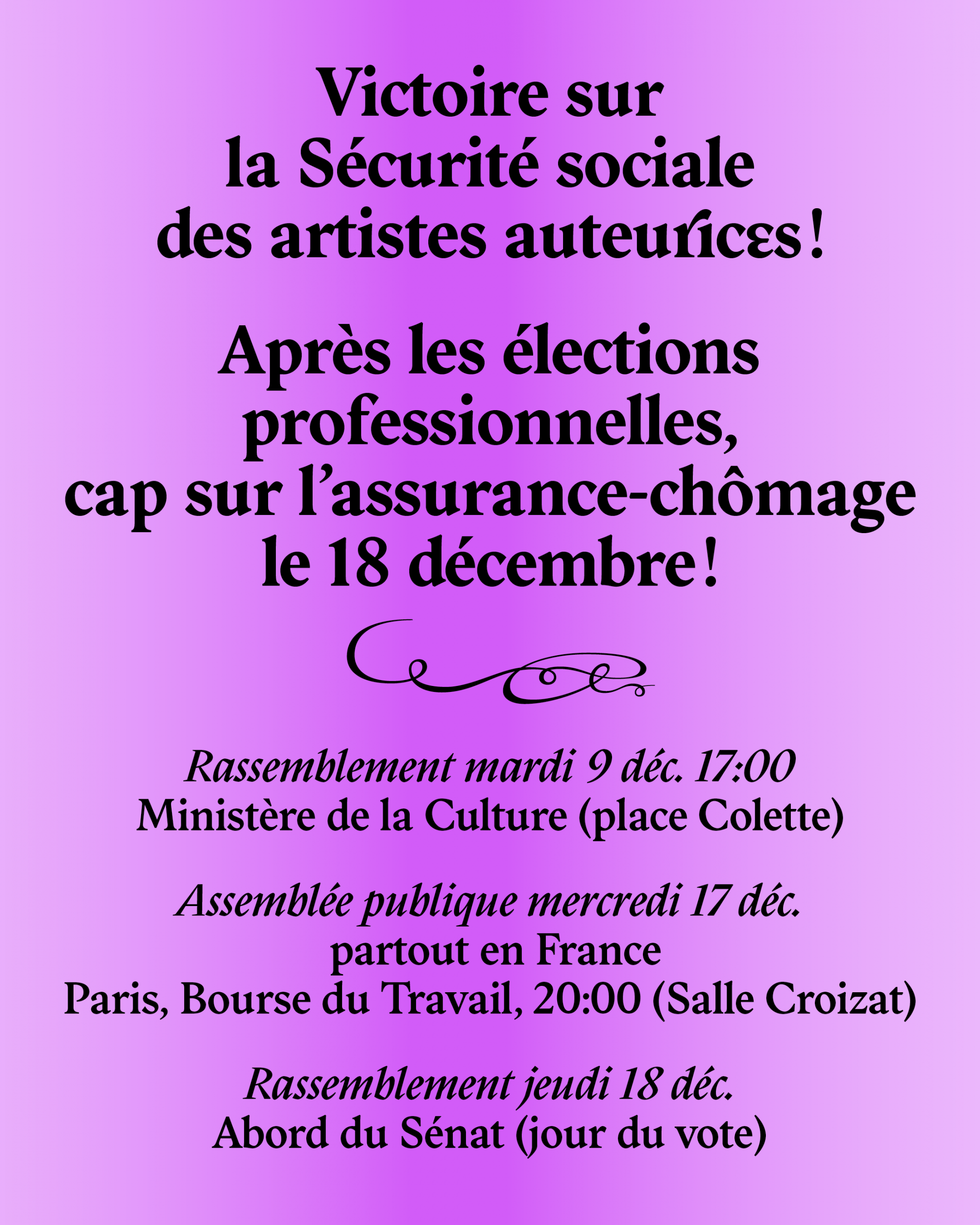 Ne nous y trompons pas : le simple fait que ce débat ait eu lieu est déjà une victoire. Il consacre la légitimité de notre revendication et impose enfin la question de la protection sociale des artistes auteur·ices dans le débat public. La mobilisation des artistes auteur·ices, la médiatisation, les articles de presse, les tribunes signées, les manifestations et les assemblées générales partout en France le démontrent clairement : ce sujet est désormais public et incontournable. ## Ce n’est donc qu’un début !