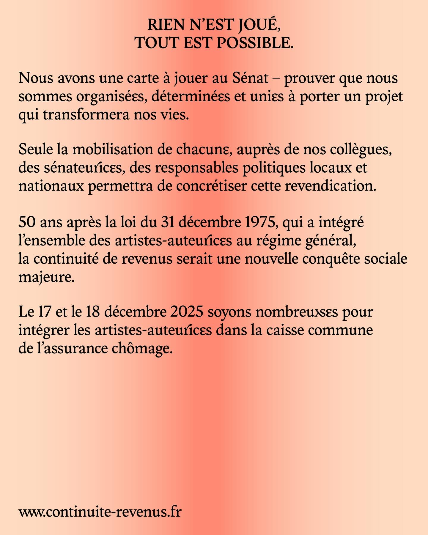 Le 17 décembre, différentes organisations syndicales dont le SNAP-CGT organisent une journée de mobilisation en prévision du vote de la loi de continuité des revenus pour les artistes-auteur·ices au Sénat. Partout en France auront lieu des assemblées générales et conférences de presse.