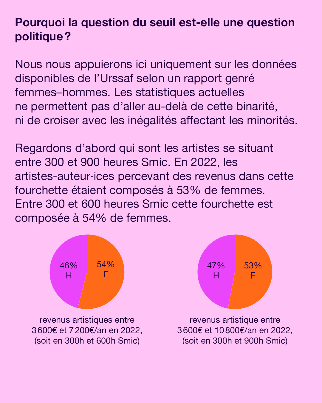 Regardons d’abord qui sont les artistes se situant entre 300 et 900 heures Smic. En 2022, les artistes-auteur·ices percevant des revenus dans cette fourchette étaient composés à 53% de femmes. Entre 300 et 600 heures Smic cette fourchette est composée à 54% de femmes.