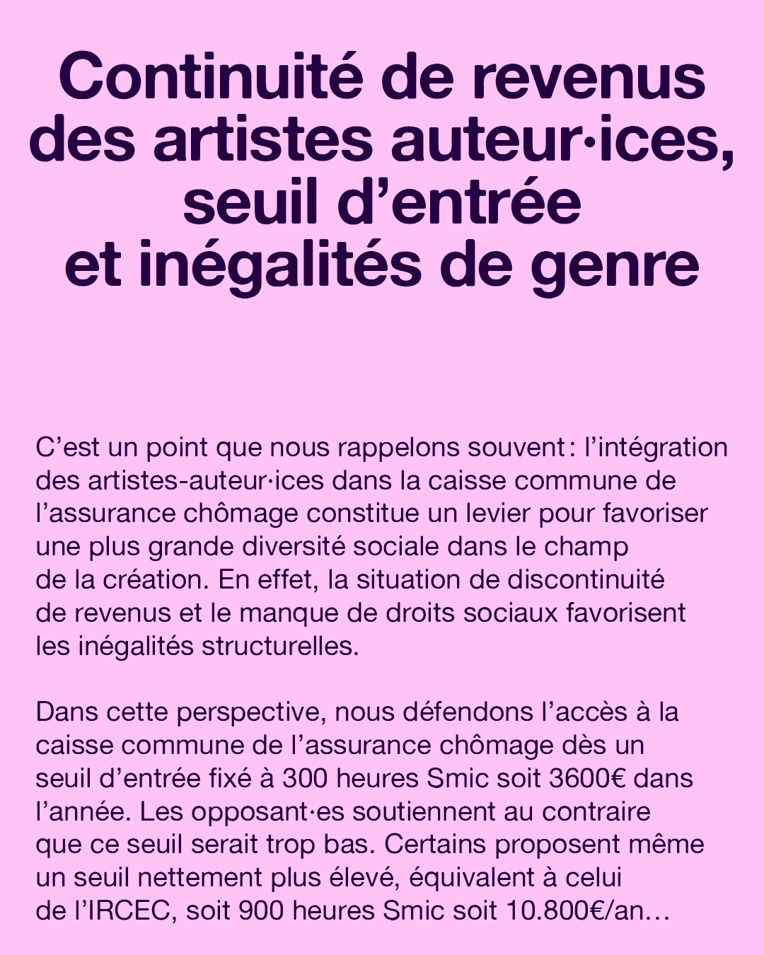Toutes ces données montrent clairement que le choix d’un seuil d’accès à l’assurance chômage pour les artistes auteur·ices n’est pas neutre et constitue un enjeu politique, davantage au regard des inégalités de revenus dans nos secteurs.