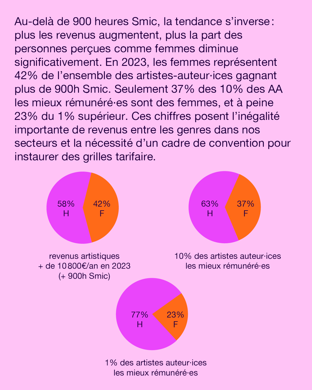 Au-delà de 900 heures Smic, la tendance s’inverse : plus les revenus augmentent, plus la part des femmes diminue significativement. En 2023, les femmes représentent 42% de l’ensemble des artistes-auteur·ices gagnant plus de 900h Smic. Seulement 37% des 10% des AA les mieux rémunéré·es sont des femmes, et à peine 23% du 1% supérieur. Ces chiffres posent l’inégalité importante de revenus entre les genres dans nos secteurs et la nécessité d’un cadre de convention pour instaurer des grilles tarifaire.