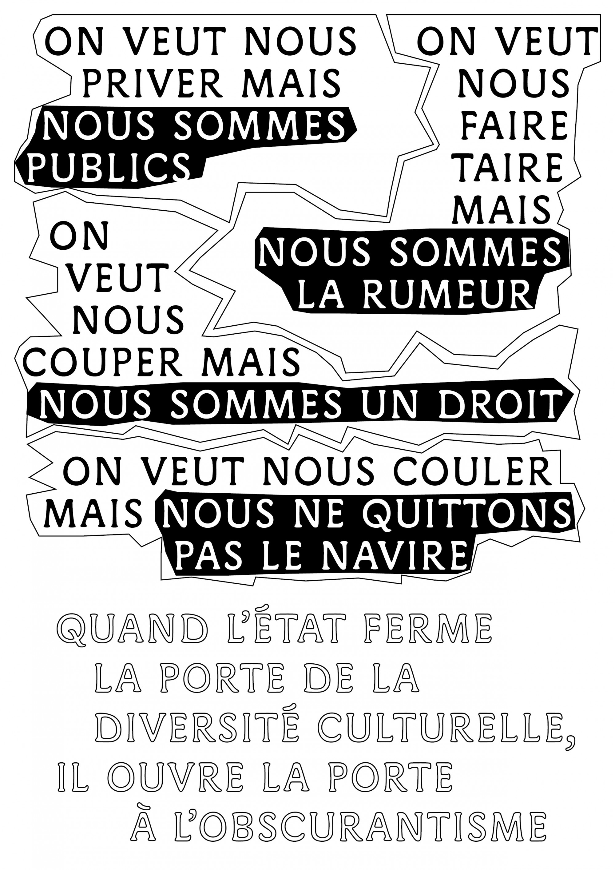 Artistes, enseignant·es, travailleur·euses de la culture, étudiant·es, citoyen·nes solidaires : organisons-nous, faisons front, défendons une culture vivante, critique et accessible à toutes et tous.