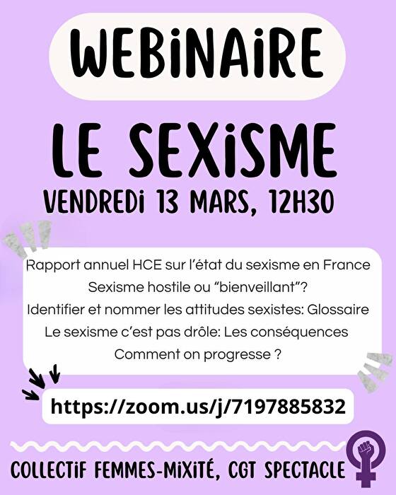 Le collectif fédéral Femmes-Mixité de la Fédération du Spectacle vous invite à un webinaire sur « le sexisme » le vendredi 13 mars de 12H30 à 14H.