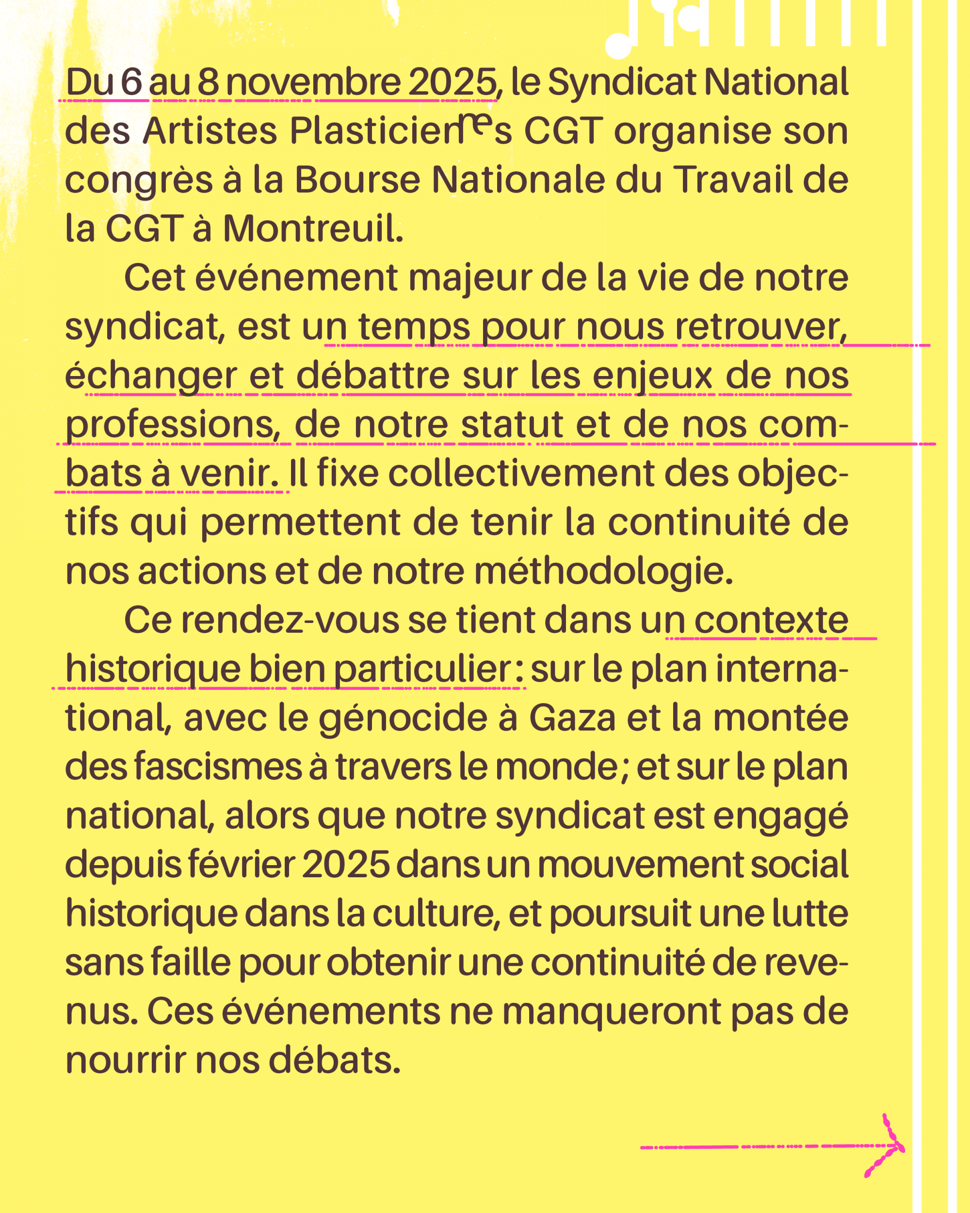Du 6 au 8 novembre 2025, le Syndicat National des Artistes Plasticien·nes CGT organise son Congrès à la Bourse Nationale du Travail à Montreuil.