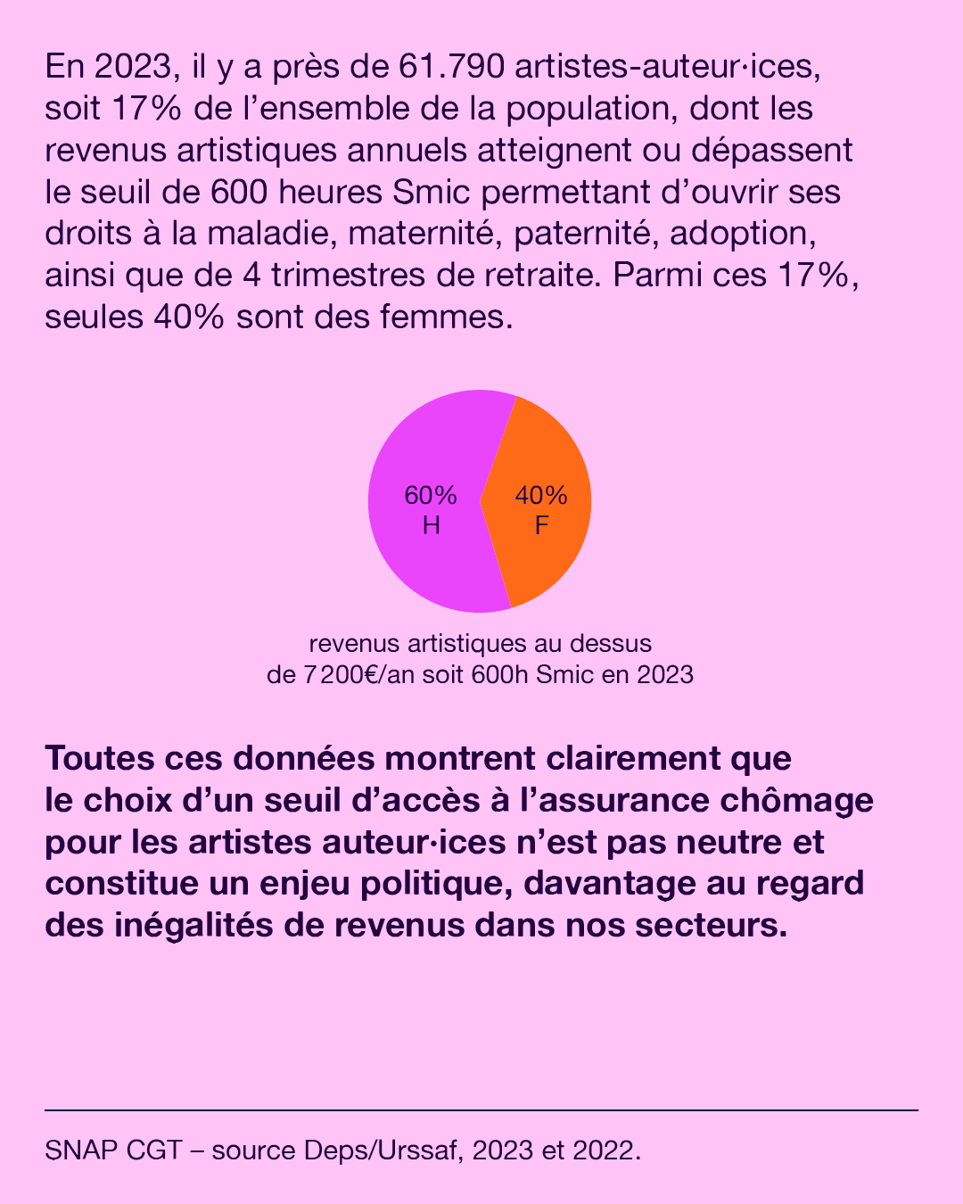 Toutes ces données montrent clairement que le choix d’un seuil d’accès à l’assurance chômage pour les artistes auteur·ices n’est pas neutre et constitue un enjeu politique, davantage au regard des inégalités de revenus dans nos secteurs.