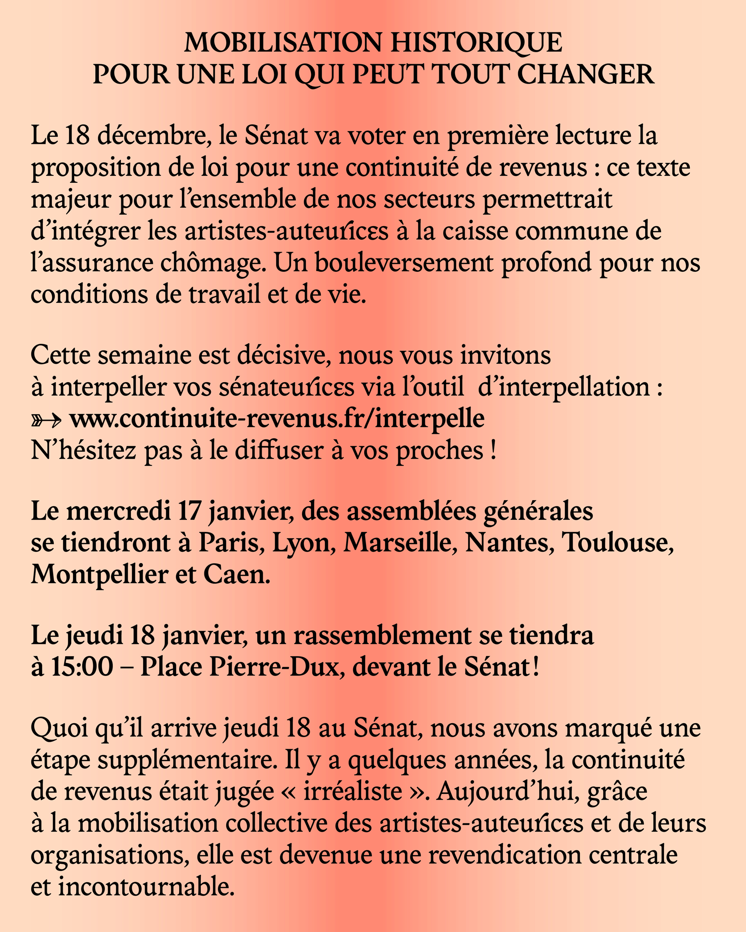 Le 17 décembre, différentes organisations syndicales dont le SNAP-CGT organisent une journée de mobilisation en prévision du vote de la loi de continuité des revenus pour les artistes-auteur·ices au Sénat. Partout en France auront lieu des assemblées générales et conférences de presse.