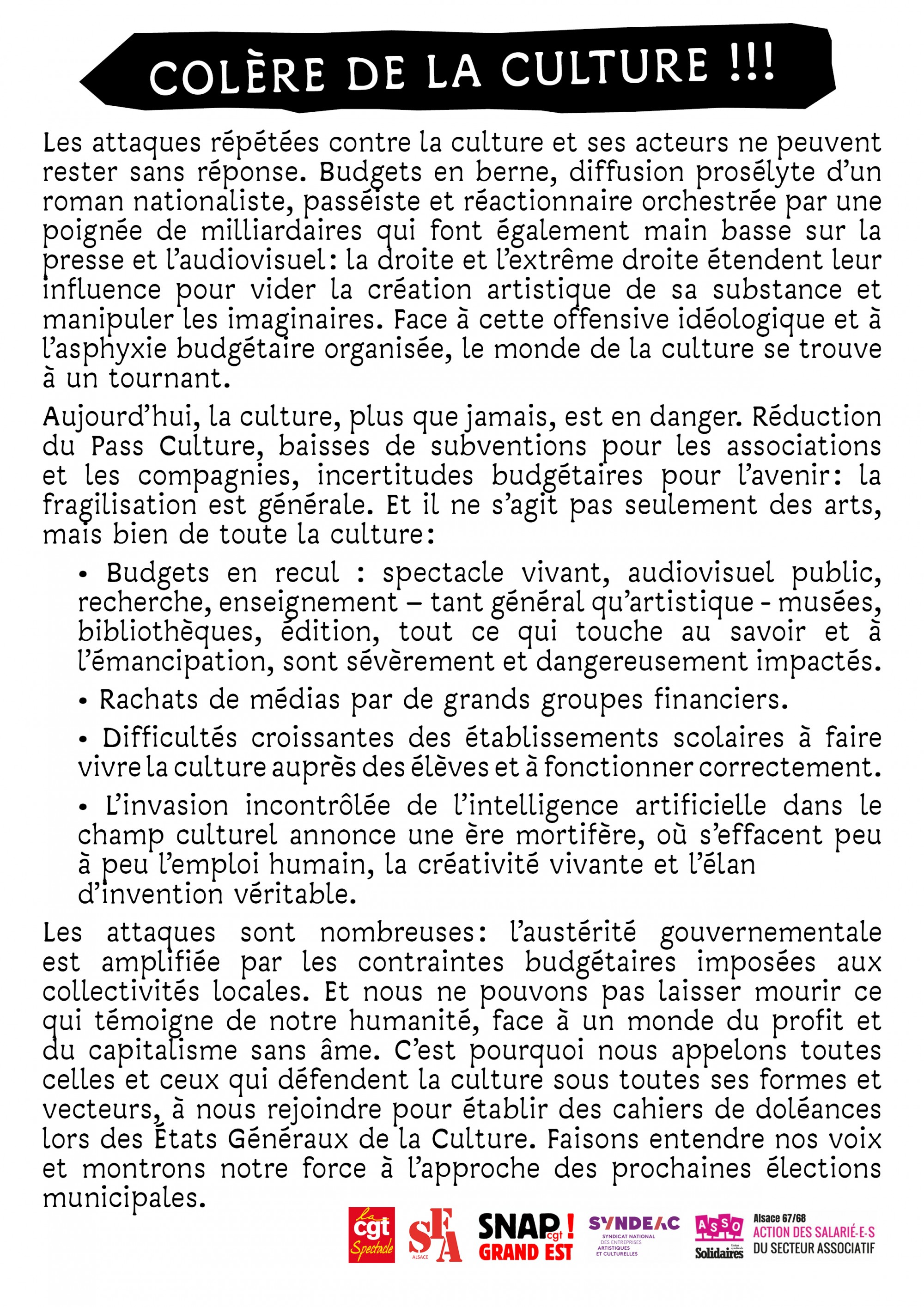 Face aux attaques répétées contre la culture, face à l'asphyxie organisée de l'éducation aux arts vivants, aux coupes budgétaires, aux discours réactionnaires et aux offensives fascisantes qui ciblent nos secteurs et nos valeurs : nous refusons de céder à l'anxiété et au silence ! La culture est un droit, non pas un privilège. Elle émancipe, elle relie, elle fait société.