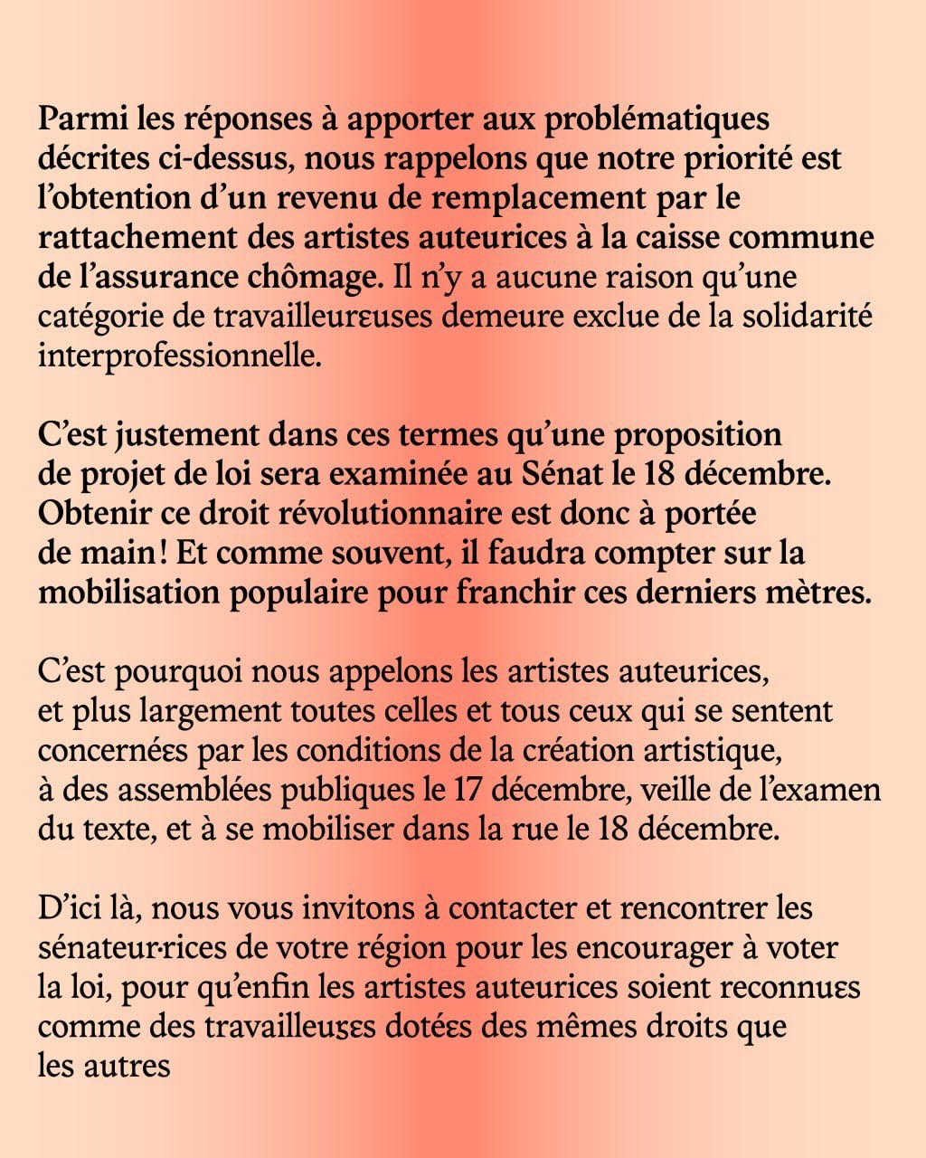 C’est pourquoi nous appelons les artistes-auteurices, et plus largement toutes celles et tous ceux qui se sentent concerné·es par les conditions de la création artistique, à des assemblées publiques le 17 décembre, veille de l’examen du texte, et à se mobiliser dans la rue le 18 décembre.